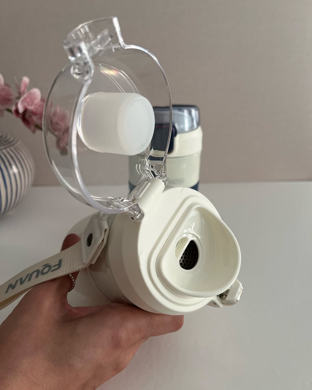 تراولماگ FQUAN استیل دو جداره ۳۱۶ جنس در از اکرولیک آسان نوش دارای توری داخل در دارای بند آویز نگهداری دمای گرم حداکثر ۶ ساعت حجم 480 میلی لیتر