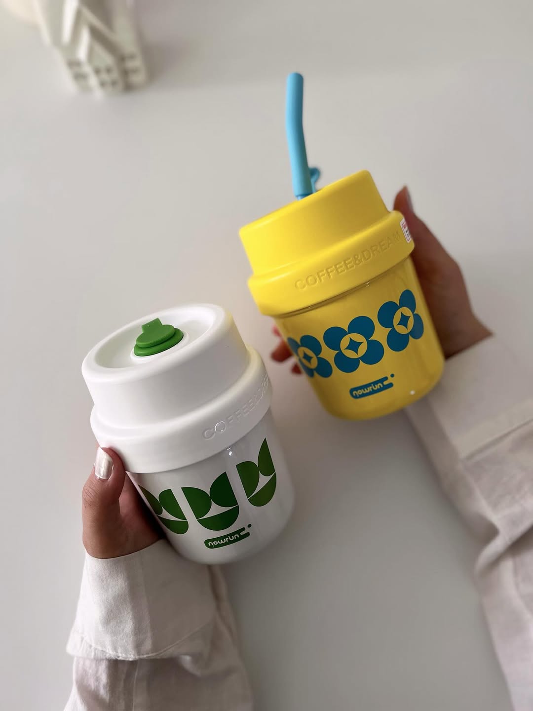 ماگ استیل در دار حجم 400 میلی لیتر دارای نی جنس قسمت بالایی نی از سیلیکون و قسمت پایینی از پلاستیک با کیفیت